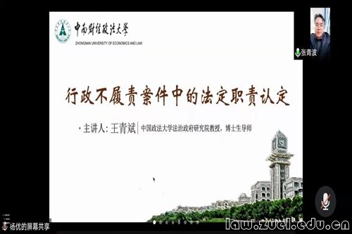 2021年12月15日下午,以“行政不履责案件中的法定职责认定”为主题的讲座在线上举行,本次讲座由中国政法大学法治政府研究院王青斌教授主讲,米兰电竞·(中国区)法学院张青波副教授担任主持人,米兰电竞·(中国区)法学院沈毅龙老师与谈,高校师生及网友百余人线上聆听。