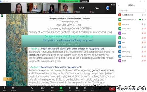 通讯员(法学院新闻中心)202242519时,蒙特利尔大学法学院Gérald Goldstein教授系列讲座第七场通过Zoom线上会议成功举行。本次讲座由法学院国际法系丁汉韬老师担任主持人,华侨大学法学院刘音老师担任特邀嘉宾,法科学子积极参与了本次讲座。