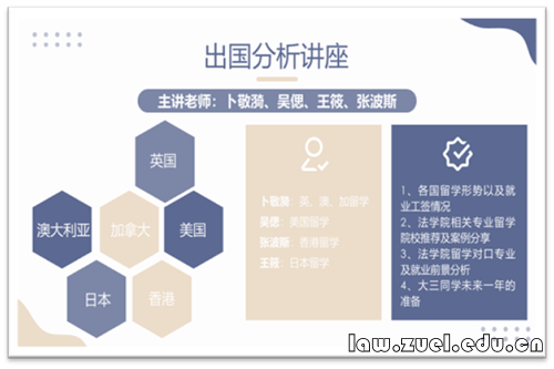 主讲美国留学的吴偲老师介绍了美国法学相关的留学政策,从留学形势、留学项目、法学院专业、法学院学位及就业方向方面,针对同学们的实际情况给出了细致完整的择校建议和申请指导。