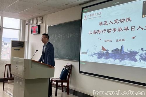 通讯员(曹丽萍 肖哲尹)法学院2022年研究生入党积极分子培训于11月10日、11日、13日在文添楼举行。本次党课共分为四讲,分别是“百年红色法治”“新时代大学生的入党动机”“以实际行动争取早日入党”“新时代党员发展流程的规范”。本期党课带领同学们重温党的历史,教导同学们端正入党动机,并为大家介绍了党员的发展流程,进一步强化大家对党的认识。