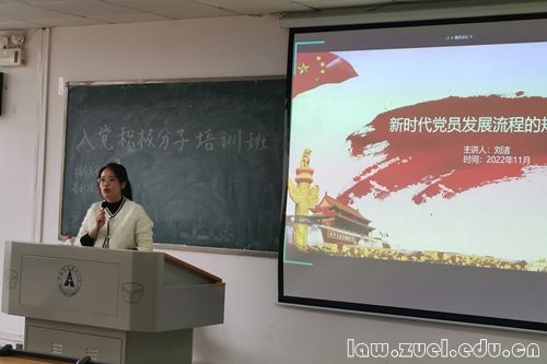 刘洁老师详细介绍了党员的发展流程和发展要求,具有很强的实用性和可操作性。刘老师鼓励同学们要不断提高自身的综合素质,加强自身党性修养,坚定理想信念,自觉以高标准接受党组织对我们的考察。希望大家通过不懈努力与自我完善,争取早日加入中国共产党。