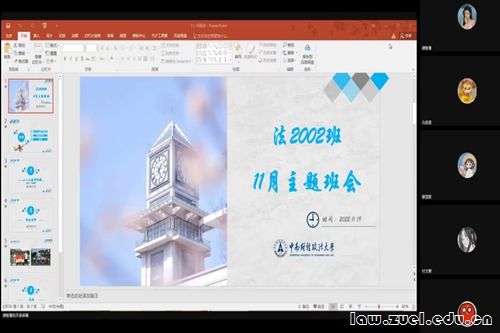 通讯员(靖智慧 张冰雨)11月19日晚,法学院法2002班在腾讯会议室召开“学习二十大·永远跟党走”主题班会,我校党的二十大精神辅导员宣讲团成员、法学院本科生辅导员吕瑞老师,为同学们宣讲党的二十大精神。班长靖智慧同学主持班会。