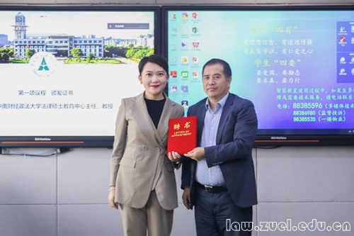 讲座伊始,举行了简短而隆重的受聘仪式,我校法律硕士教育中心主任简基松教授为冯清清律师颁发“实务导师”聘书,激励中南大学子不断地将“理论”向“实务”转化。