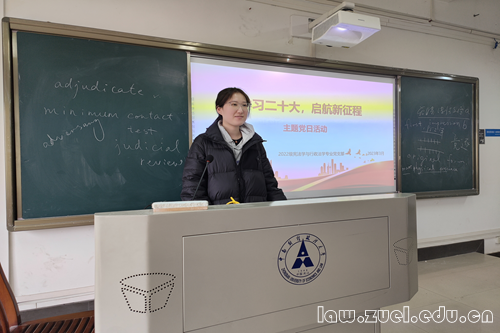 2023年3月23日上午,22级法学理论党支部于文澴楼323教室,开展了“学思践悟新思想,团结奋斗开新局”党日活动,入党积极分子田佳妮、许媛发表了学习感想。田佳妮说到:“党的领导是中国特色社会主义的本质特征,所以在实现中华民族伟大复兴的过程中,一定要坚持中国共产党的领导,发挥党总揽全局,协调各方的领导核心作用。我们也要以坚定的理想信念,跟随党的正确指令奋进向前。”
