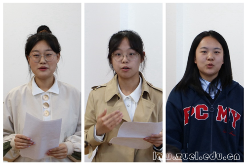 学生代表发言环节,谢丛咛、方冰、张若彤三位学生代表分享了自己在中南大学习生活的经历与成长感悟,表达了对学校领导、老师、校友们一直以来的关心支持的感谢,并表示法科学子们定当传承学院优良传统,努力学习,练好本领,为学校发展与民族复兴贡献力量。
