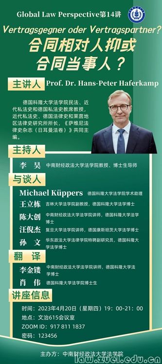 Prof. Dr. Hans-Peter Haferkamp 德国科隆大学法学院民法、近代私法史和德国私法史教席教授,近代私法史、德国法律史和莱茵地区法律史研究所所长,《萨维尼法律史杂志(日耳曼法卷)》共同主编