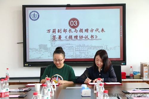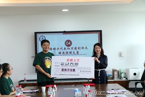 捐赠仪式上,万莉副部长与捐赠方代表、2010级法律硕士李静怡签署《捐赠协议书》,捐赠方代表、2009级法律硕士王子立向万莉副部长赠送捐赠支票。随后,万莉副部长向捐赠方代表、2010级法律硕士陈程刚赠送捐赠证书。