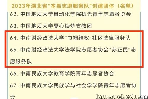 通讯员(邓齐林 胡灿 秦思乐)近日,经各地、各单位逐级推荐、省级审查评选,100支青年志愿服务队被确定为2023年湖北省“本禹志愿服务队”创建团体,创建时间为2023年7月至12月。我校法学院志愿者协会的“巾帼维权”社区法律服务队和“苏正民”志愿服务队成功入选,获得2023年湖北省“本禹志愿服务队”创建团体资格。