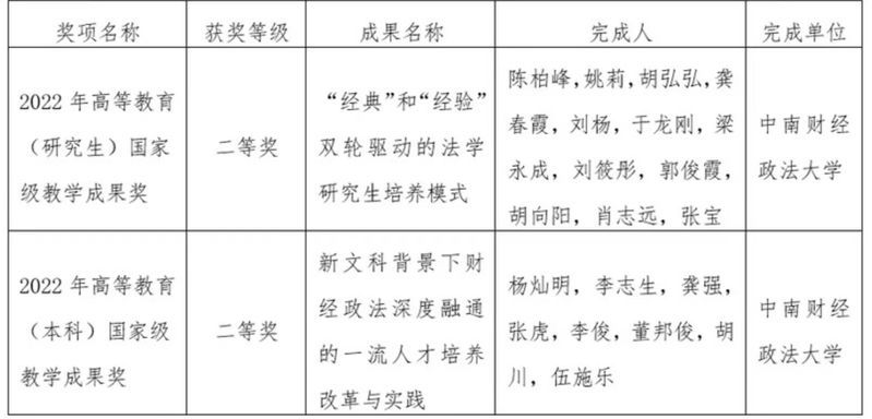 教育部近日发布《教育部关于批准2022年国家级教学成果奖获奖项目的决定》(教师〔2023〕4号)。我院陈柏峰院长主持的《“经典”和“经验”双轮驱动的法学研究生培养模式》教学成果荣获高等教育(研究生)国家级教学成果奖二等奖;李俊副院长参与的《新文科背景下财经政法深度融通的一流人才培养改革与实践》教学成果荣获高等教育(本科)国家级教学成果奖二等奖。