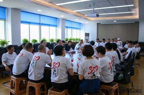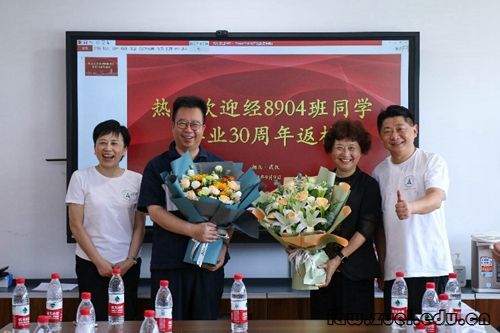 随后,经8904班校友们共聚文治楼615会议室开展座谈。校友代表向刘大洪、马继红两位恩师献上花束,在教师节到来之际代表全班同学表达了对老师的拳拳感恩心与深深祝愿情。校友们依次汇报了自己的工作生活情况,在共叙情谊的同时向学校与老师致以了最诚挚的感谢。“如今我们都坚守在各自的岗位上,但永远记得是学校与老师的谆谆教诲才让我们有了立足于社会的一技之长。”