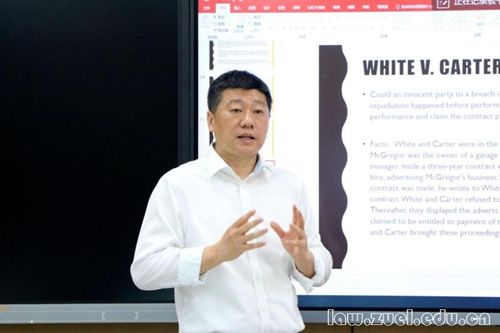 随后,陈磊教授以合同解除的方式为切入点,结合“White and Carter v McGregor”案件重点讨论先期违约在普通法下的构成要件、法律后果及其例外情况,围绕这一案件进行问答互动,同学们积极思考并热情反馈。陈磊教授还指出,我国民法中的不安抗辩权和预期违约均为预期不履行的救济制度,在适用要件和法律效果上存在重叠的可能性,如何梳理二者的关系一直是我国民法学界较为关注的问题。