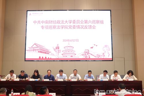 按照校党委巡察工作统一部署,6月27日中午,学校第四届党委第一批巡察第六巡察组专项巡察法学院党委(含知识产权研究中心、知识产权学院、法律硕士教育中心、国家治理学院)情况反馈会议,在法科大楼一楼大报告厅召开。