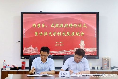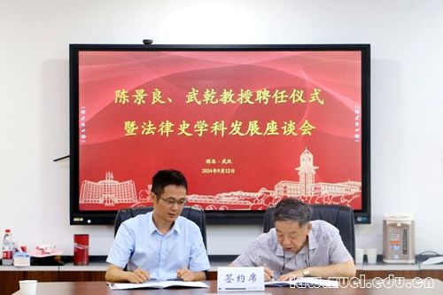通讯员(曾怡然 盛欣怡 柳舒婷 宋立威)9月12日下午,陈景良、武乾教授聘任仪式暨法律史学科发展座谈会在文治楼615会议室隆重举行。会议由法学院党委书记张学平主持,法学院院长、国家治理学院院长陈柏峰以及理论法学系全体教师出席了此次聘任仪式及座谈会。