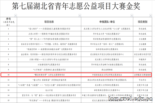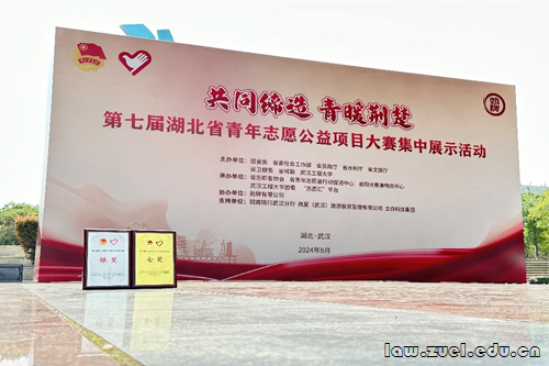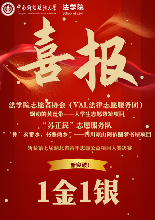 通讯员(杨诵语 王重一 陈锶钦)9月6日至8日,由团省委、省委社会工作部等单位联合主办的第七届湖北省青年志愿服务公益项目大赛决赛及交流活动在武汉工程大学举行。我院法学院志愿者协会(VAL法律志愿服务团)参赛项目“飘动的黄丝带——大学生志愿帮矫项目”与“苏正民”志愿服务队参赛项目“‘彝’衣带水,书系两乡——四川凉山阿依圆梦书屋项目”从全省185个项目中脱颖而出,破纪录取得了1金1银的优异成绩。