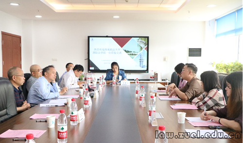 10月11日下午,西南政法大学国际法学院副院长梅傲、党委副书记王黎、综合办公室负责人刘馨、研究生教学秘书倪蕾一行来访我院,在文治615会议室开展座谈交流。法学院副院长江河,国际法学系系主任徐伟功,国际经济法系系主任杨洪,国际法学系教授黄志慧,副教授雷益丹,丁汉韬老师,梁卓老师,向伦老师等出席会议。徐伟功教授主持本次座谈会。