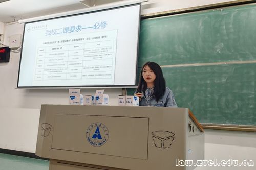 胡雨萱,现任法学院团委二课中心办公室副主任。她从二课的产生背景、发展历程、申请标准、申请程序及反馈渠道几个方面展开分享。她向同学们介绍了二课对于大学生涯的重要意义,鼓励学生们认真规划学习生涯,积极参加学校举办的各类理论学习和社会实践活动,夯实理论知识,提高实践能力,努力成为德智体美劳全面发展的社会主义建设者和接班人。