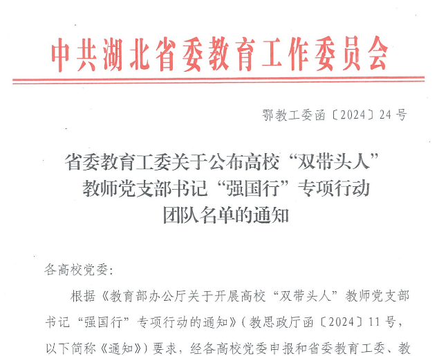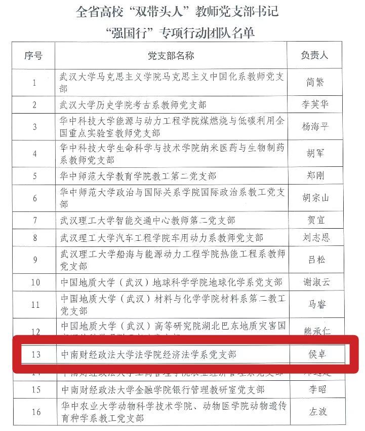 近日,中共湖北省委教育工作委员会公布了全省高校“双带头人”教师党支部书记“强国行”专项行动团队名单,我院经济法学系党支部成功入选。这是继“全国党建工作样板支部”“全省党建工作标杆院系”“全省高校‘双带头人’教师党支部书记工作室”“全省高校研究生样板党支部”“全省高校研究生党员标兵”后,法学院党委持续推进新时代高校党建工作提质创优取得的新成果。