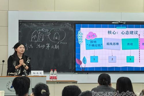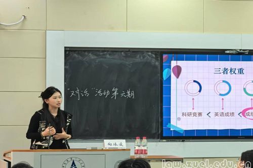 通讯员(张争妍 王一惟 郑霖姗)为全面落实立德树人根本任务,帮助法学学子深入了解保研信息,明晰学习方向,11月14日,法学院2023级本科生“对话”系列讲座第六期活动于文波楼智慧教室109顺利举办。法学院民商2101班向冰凌(推免至清华大学)受邀分享保研经验与方法,年级辅导员王智健老师出席活动,法学院本科生2023级团总支学习委员王怡蘅主持活动。