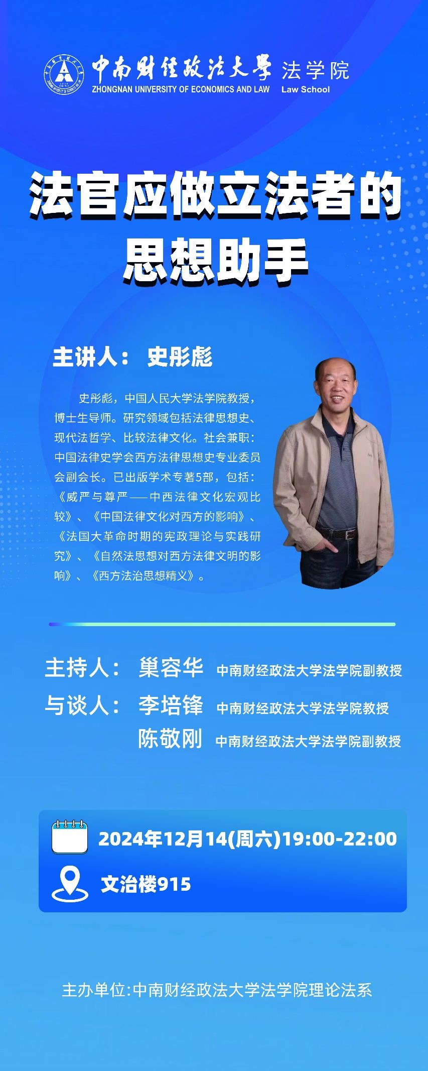 主讲人简介:史彤彪,中国人民大学法学院教授,博士生导师。研究领域包括法律思想史、现代法哲学、比较法律文化。社会兼职:中国法律史学会西方法律思想史专业委员会副会长。已出版学术专著5部,包括:《威严与尊严——中西法律文化宏观比较》、《中国法律文化对西方的影响》、《法国大革命时期的宪政理论与实践研究》、《自然法思想对西方法律文明的影响》、《西方法治思想精义》。