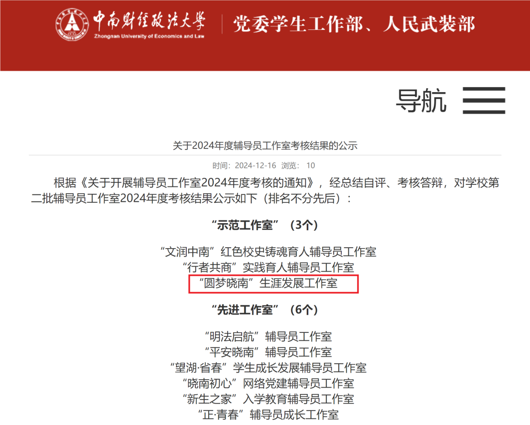近日,学校举行了2024年度辅导员工作室考核。法学院年初获得校第二批辅导员工作室立项的“圆梦晓南”本科生生涯发展工作室、“法言微语”研究生网络思政育人辅导员工作室均通过答辩验收,“圆梦晓南”生涯发展工作室荣获“示范工作室”称号。