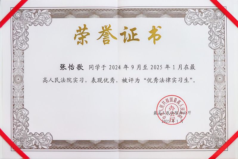 2024年9月,经我院推荐、学校选拔、最高人民法院考察,2023级经济法学硕士研究生张怡歌入选最高人民法院第十五批法律实习生,进入最高人民法院民事审判第二庭实习。日前,为表彰实习期间表现优秀的法律实习生,经各实习单位严格选拔推荐,最高人民法院政治部、机关党委共同研究审核,我院张怡歌同学荣获最高人民法院第十五批“优秀法律实习生”称号。