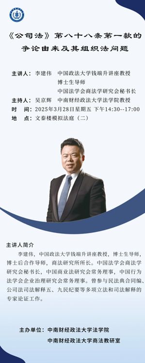 主讲人:李建伟 中国政法大学钱端升讲座教授,博士生导师,中国法学会商法学研究会秘书长