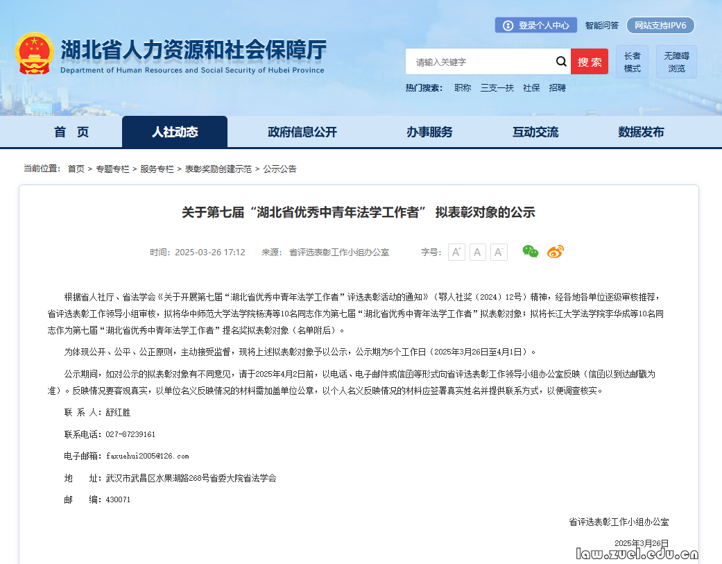 通讯员(孙艺)近日,湖北省人力资源和社会保障厅官网发布了《关于第七届“湖北省优秀中青年法学工作者”拟表彰对象的公示》,我院副院长张宝教授、经济法学系主任侯卓教授,法与经济学院院长黄美玲教授荣获“湖北省优秀中青年法学工作者”表彰;法学院袁中华教授、《法商研究》谭冰霖编审(正高级)荣获“湖北省优秀中青年法学工作者”提名奖表彰。