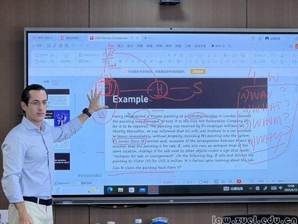 5月13日,蒂亚戈·里斯教授从比较法的视角详细剖析了财产权的特征。里斯教授通过列举经典案例引发学生们对物权相关法律问题的思考,从性质、客体、效力三个方面对物权和债权进行了区分,并对巴西、中国、德国、法国的相关法律规定进行了解读。