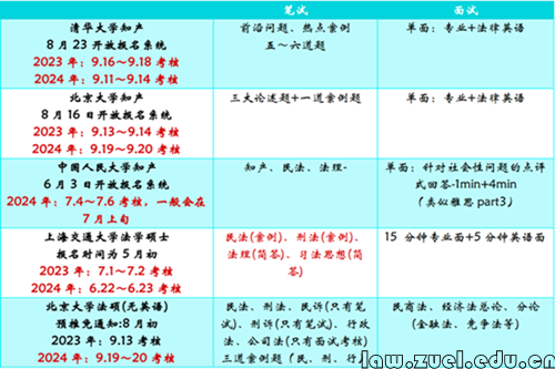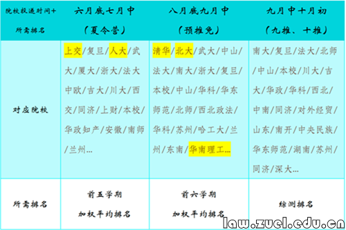 保研的技巧主要是明确目标,当你明确想冲的学校的时候,那么你在每一天都会去落实任务。大家还需要注意,不要让时间冲突,特别是在期末月的时候。一般来说,我们保研开始院校投递是在当年的6月份,同时也是期末月,所以要关注某些学校的报名时间和参营时间会不会跟期末考试冲突。我当时就是因为我的一个破产法考试跟上交的面试相冲突了,所以我是没有报名的。至于具体的一些投递时间,我制作了两张图,可供大家参考。