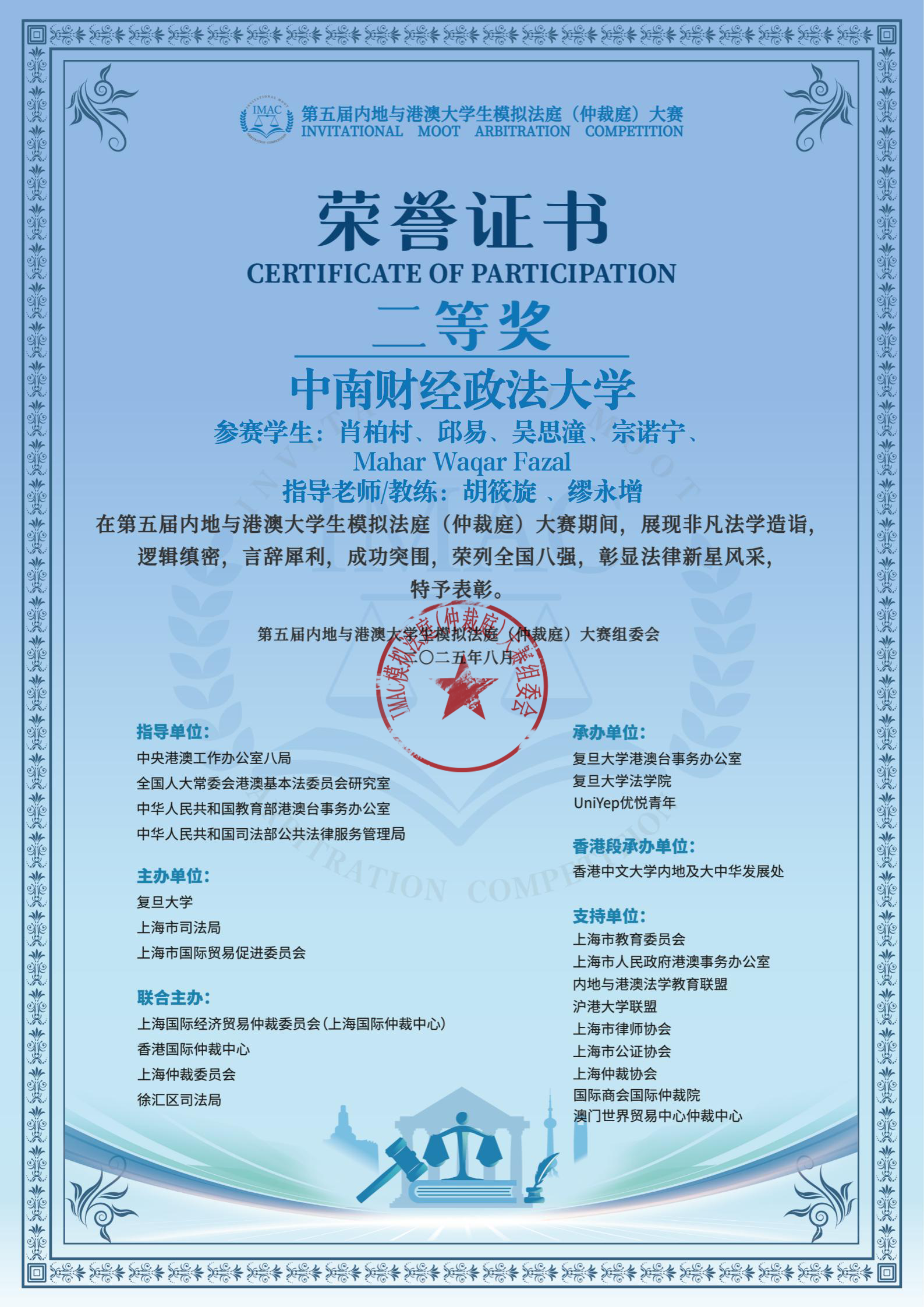 8月23至24日,第五届内地与港澳大学生模拟法庭(仲裁庭)线下淘汰赛在复旦大学凯原法学院落下帷幕。我校代表队从中国内地、香港及澳门地区的82支高校劲旅中突围,最终斩获全国二等奖,位列八强。