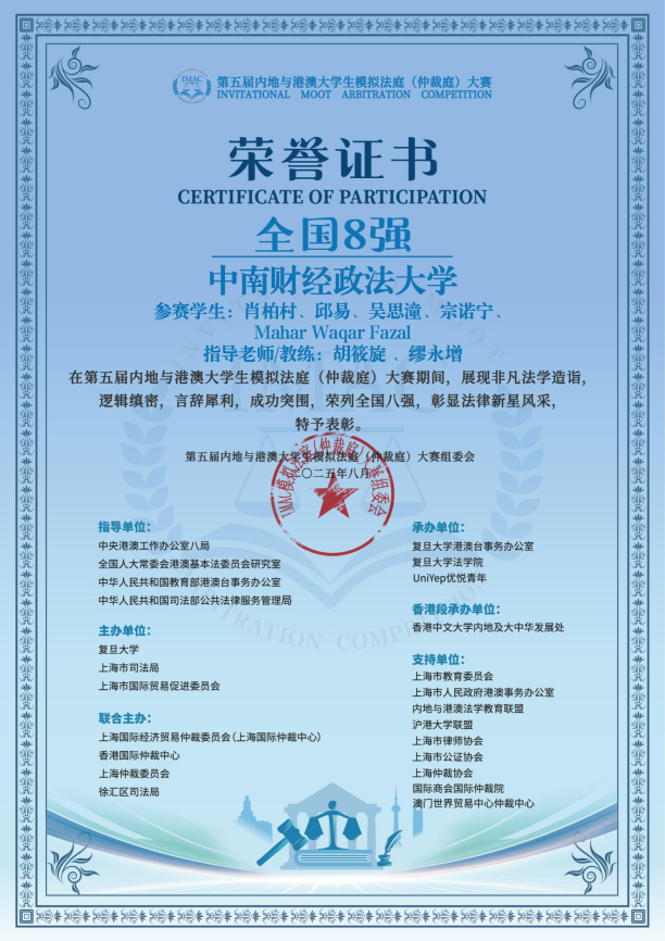 本次赛事案例聚焦船舶维修合同跨境纠纷,涉及内地与香港法域下的仲裁程序、法律适用、代理关系认定等前沿实务问题。自6月书状轮启动以来,团队历时两月系统研读案例,先后完成2万余字法律文书。庭辩环节中,队员们以精准的法律论证、流利的双语表达,先以绝对优势击败天津大学晋级八强,后在半决赛中与华东政法大学展开激烈交锋,虽憾负对手,但其专业素养获仲裁员一致赞誉:“展现了内地青年法律人卓越的国际视野与实务能力。”