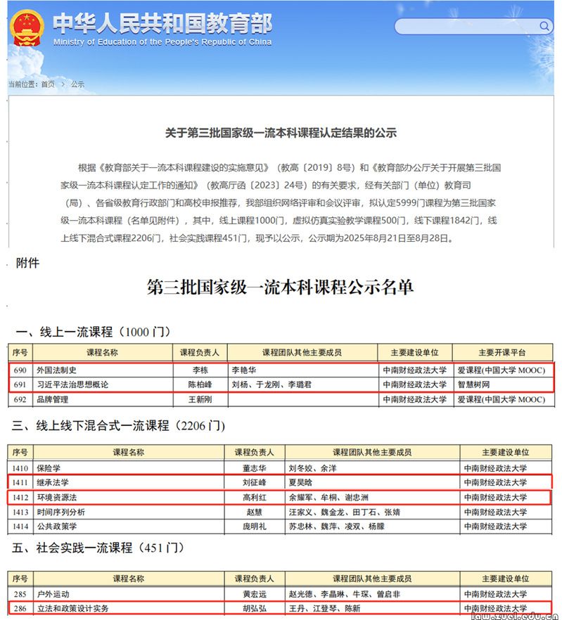 近日,教育部高等教育司发布《关于第三批国家级一流本科课程认定结果的公示》,我院5门课程拟被认定为第三批国家级一流本科课程。其中,《习近平法治思想概论》《外国法制史》拟被认定为国家级线上一流课程,《环境资源法》《继承法学》拟被认定为国家级线上线下混合式一流课程,《立法和政策设计实务》拟被认定为国家级社会实践一流课程。