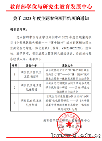 初稿通讯员(王惠民)近日,教育部学位与研究生教育发展中心发布了《关于2023年度主题案例项目结项的通知》,我院2023年度入选主题案例项目《中部地区绿色崛起——“襄十随神”城市群区域协同立法共促生态绿色一体化发展》(编号:ZT-231052029),经过严格的评审流程已经通过审核完成验收,顺利结项。该项目由法学院教授、研究生院院长胡弘弘作为首席专家主持,团队成员包括法学院副教授江登琴,副教授付婧,湖北地方立法研究中心成员王丹,中国法学会立法学研究会副会长、“立法和政策设计”课程实务导师张绍明,湖北省地方立法研究和人才培养基地(中南大)研究助理、法学院博士研究生王惠民。项目成果将按程序收录入中国专业学位案例中心案例库。