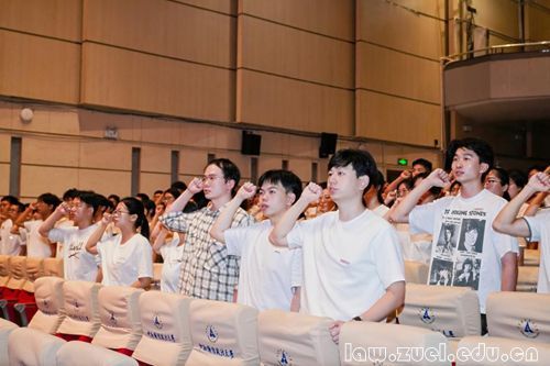 随后,全体新生起立,在法学院副院长侯卓教授的带领下进行学术规范与科研诚信宣誓。“恪守学术规范,崇尚科研诚信;尊重知识产权,维护学术尊严;杜绝抄袭剽窃,拒绝弄虚作假……”,铿锵有力的誓言回荡在南湖会堂,不仅是新生对学术道德的庄严承诺,更是对法治理想的坚定守护,为未来的学术研究立“规矩”、划“红线”。