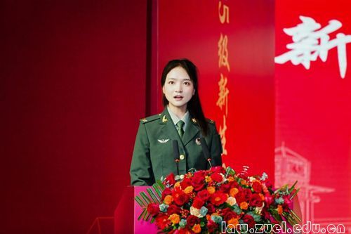 新生代表、退伍女兵凌帅歌回顾了在东海前哨戍边的军旅生涯,正是“责任重于泰山”的信念与“规则意识高于一切”的作风,让她选择投身法学领域。她结合自己的经历和感悟,表示要以军人韧劲攻克专业壁垒、以文人温度诠释法治精神、以建设者担当深耕基层法治,展现了新时代青年从“保家卫国”到“法治强国”的初心传承。