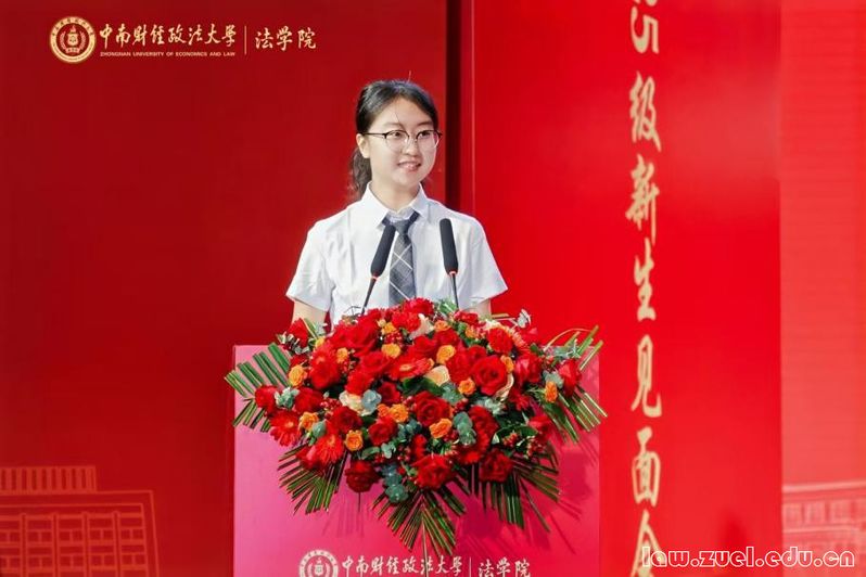 法2504班本科生吕星瑶作为新生代表发言。她以天津从屈辱到开放的巨变为引,感慨“法治立柱架梁,铸就大国自信”,并分享母亲作为公益律师的感人事迹,誓言“以信念为舟、法律为桨、奋斗为帆,不负法治所向”。