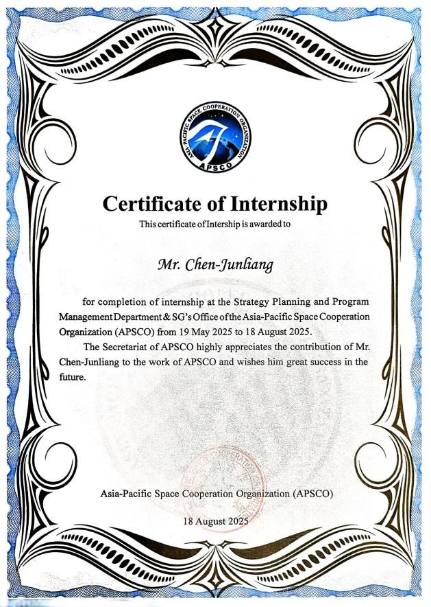 2025年5月至8月,经校出国(境)学习交流资助项目与法学院共同资助,我校法学院2021级本科生陈俊良、研究生刘昕宇赴亚太空间合作组织(APSCO)实习3个月,分别轮岗于战略规划与项目管理部(SPPM)、秘书长办公室(SG Office)及教育与培训部(E&T)。