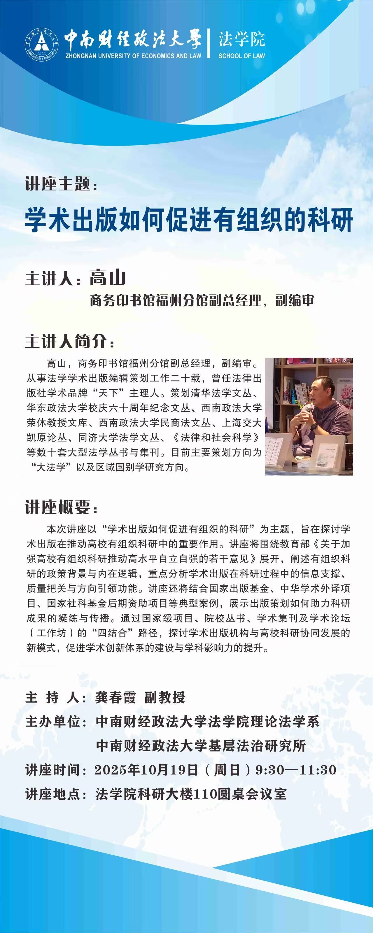 主讲人简介:高山,商务印书馆福州分馆副总经理,副编审。从事法学学术出版编辑策划工作二十载,曾任法律出版社学术品牌“天下”主理人。策划清华法学文丛、华东政法大学校庆六十周年纪念文丛、西南政法大学荣休教授文库、西南政法大学民商法文丛、上海交大凯原论丛、同济大学法学文丛、《法律和社会科学》等数十套大型法学丛书与集刊。目前主要策划方向为“大法学”以及区域国别学研究方向。