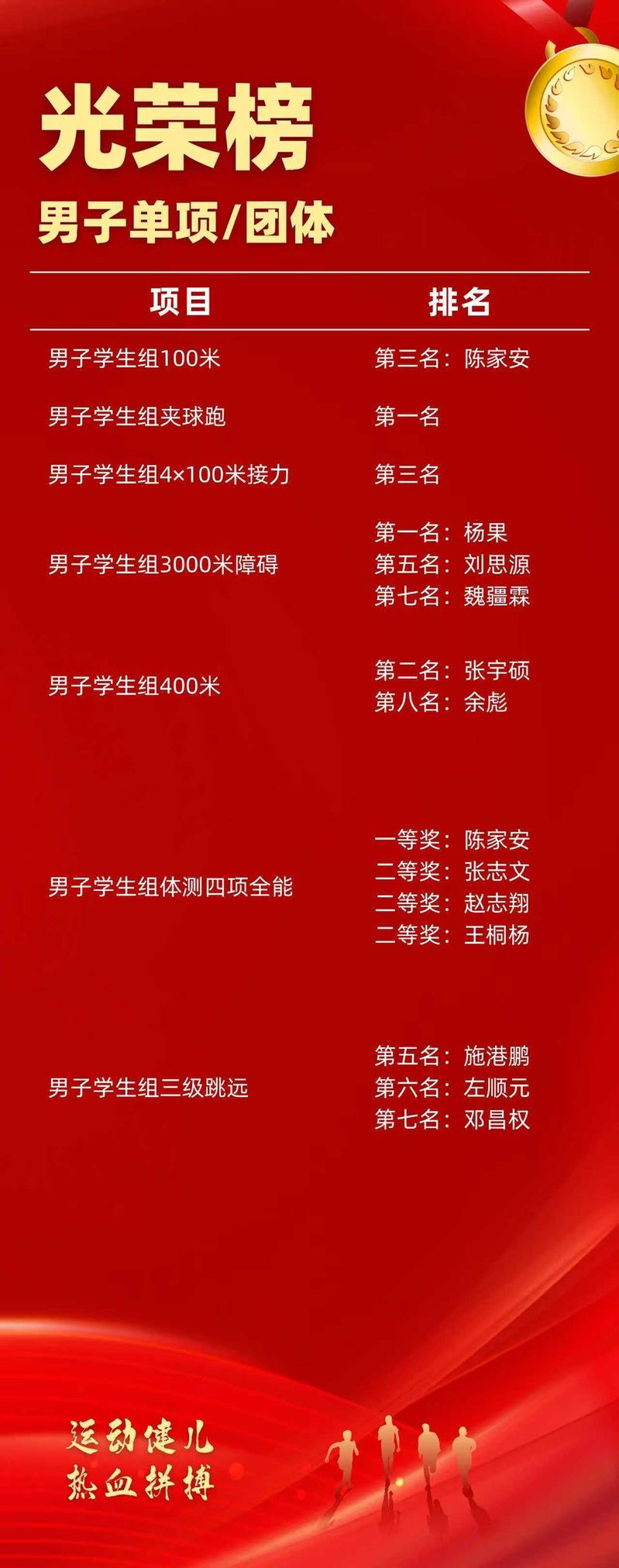 四个人,四段征程,小小的接力棒串联起四个不屈的灵魂。每一次接力,都是一份无言的默契,一次信任的传递。少年意气风发,步履铿锵。意志让他们突破身体的极限,铸就团队的荣光。最终,我院4×100男子接力代表队斩获第三名的佳绩!