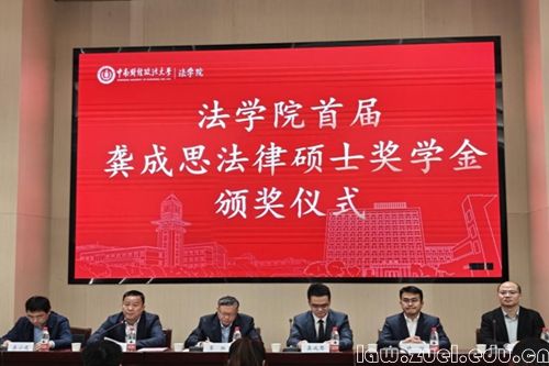 最后,侯猛院长宣读首届“龚成思法律硕士奖学金”获奖名单,其中法律(法学)专业舒睿、王佳琪、徐欣怡、孔德秀、张佳雯,法律(非法学)专业张彬、刘晓艺、陶璐萍、王加明、解钧毅共10位同学获此殊荣,参会嘉宾共同为获奖同学颁发荣誉证书并合影。