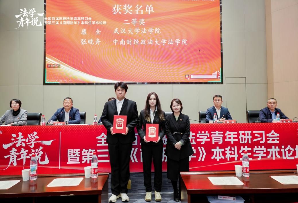 开幕式上,同步举办了第十三届“南湖法学杯”全国本科生学术论文大赛颁奖仪式。创刊于2010年的《南湖法学》2021年首批入选“北大法宝”期刊库,持续为全国本科法学学子搭建高水平学术交流平台。本届赛事共收到470篇投稿。最终,赖美辰(中南财经政法大学)获一等奖,康全(武汉大学)、张晚舟(中南财经政法大学)获二等奖,王吉(浙江大学)、黄昱翔(中国政法大学)、李赛鹏(山西大学)获三等奖。开幕式上,与会领导为获奖同学颁发了获奖证书。