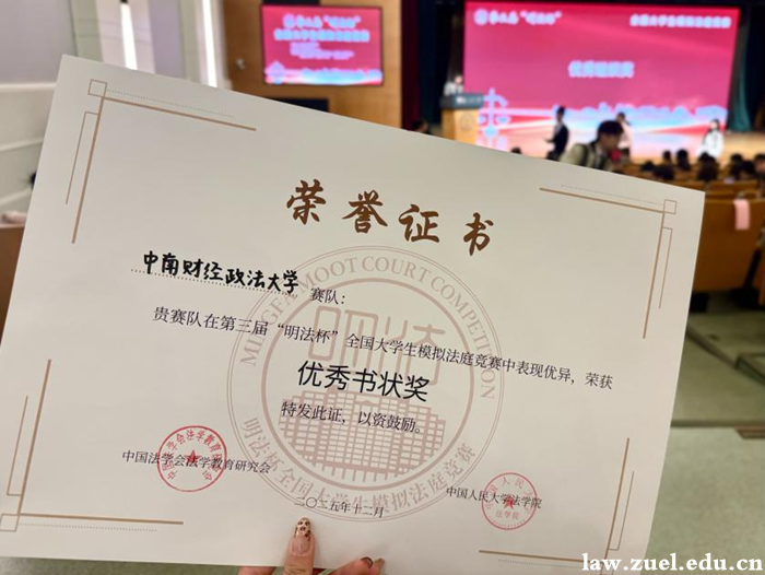 2025年11月28日至12月1日,第三届“明法杯”全国大学生模拟法庭竞赛在中国人民大学成功举办。经过多轮专业评审与激烈角逐,我校代表队凭借逻辑缜密、论证详实的法律文书,以书状得分第一的优异成绩斩获优秀书状奖,充分展现了我校法学学子扎实的学术功底、卓越的文书撰写能力以及严谨的法律思辨素养。