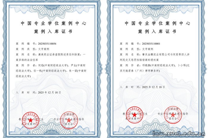 近日,全国法律专业学位研究生教育指导委员会公布了第五批法律硕士专业学位文字教学案例评审结果,我院提交的五项法律硕士专业学位专业教学案例成功入选,分别为姚莉老师团队撰写的《数字赋能刑事涉案财物处置一体化模式》,胡弘弘老师团队撰写的《行政救济的功能定位与路径选择——以廖某某诉四川省人民政府系列案为例》,胡东海老师撰写的《A商贸经营部与张某融资租赁合同无效案》,何焰老师团队撰写的《康美药业证券虚假陈述责任纠纷案:一案多维的法治宝库》,邓晓静老师团队撰写的《肇庆金鹏实业有限公司与何某等四人涉刑民交叉惩罚性赔偿商标侵权案》。