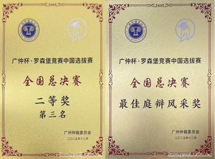 2025年12月24日,广州仲裁委员会主办的“广仲杯·罗森堡竞赛中国选拔赛”全国总决赛圆满落幕。该赛事作为国际知名仲裁竞赛“俄罗斯罗森堡国际商事仲裁竞赛”在中国的唯一官方预选通道,旨在为我国涉外法治建设培养具有国际视野和专业素养的青年仲裁人才。经过与国内多所知名法学院校的激烈交锋,米兰电竞·(中国区)法学院代表队凭借扎实的专业素养与出色的庭辩表现,最终荣获全国总决赛二等奖(位列第三),同时队长杨胜源凭借其出色的陈词与严谨的逻辑,荣获赛事“最佳庭辩风采奖”。