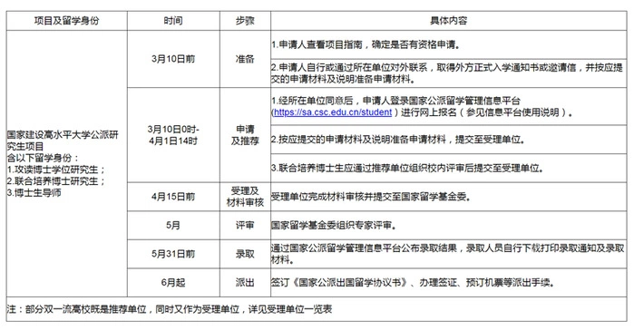 近日,国家留学基金管理委员会(以下简称“国家留学基金委”)发布2026年国家建设高水平大学公派研究生项目相关信息。根据选派工作流程。申请人应在2026年3月10日前查看2026年国家建设高水平大学公派研究生项目指南,网上报名及申请受理时间为3月10日0时至4月1日14时。通知内容原文如下: