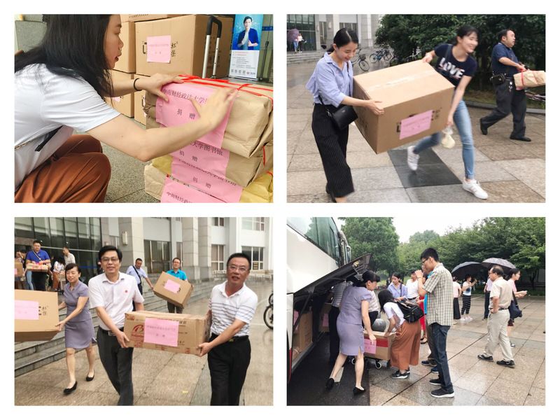 正值梅雨时节,天公不作美,早上7点就下着小雨。图书馆党员们冒着细雨,有条不紊地搬运物资装车。
