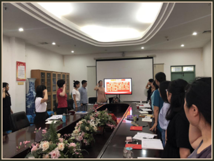 在庄重的铮铮誓言下,党员重温入党誓词,表达为党的事业奋斗终身的信心和决心。诵读党章以支部书记轮诵的方式进行,通过反复诵读,将党章内容刻印于心,党性观念固化于脑。随后,许棠书记根据党委组织部、党校对7月份主题党日活动提出的纪律要求给全体党员做了详细的传达。