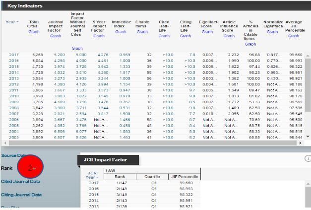 点击下方的Rank(2)按钮,即可得到该刊物在所属学科的历年排名情况,如Yale Law Journal期刊属于Law学科,2017年,其在法学147本SSCI期刊中的排名为1,期刊分区为Q1。