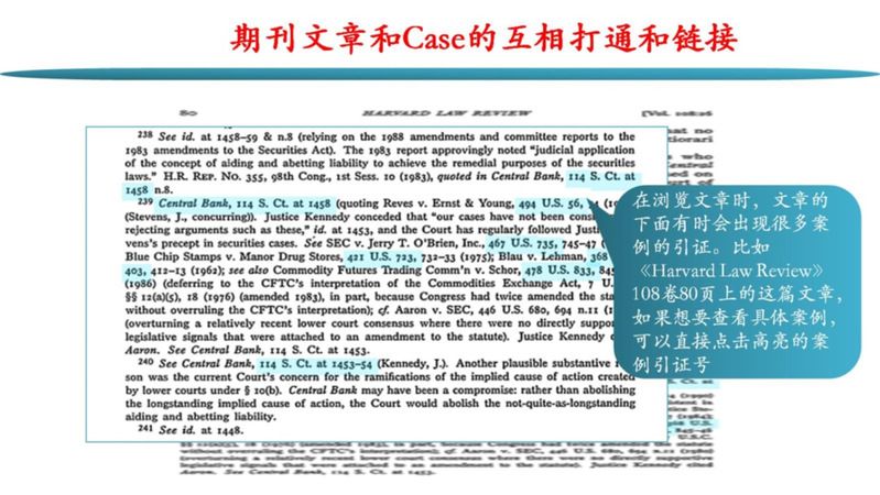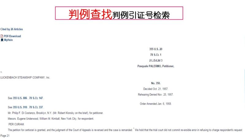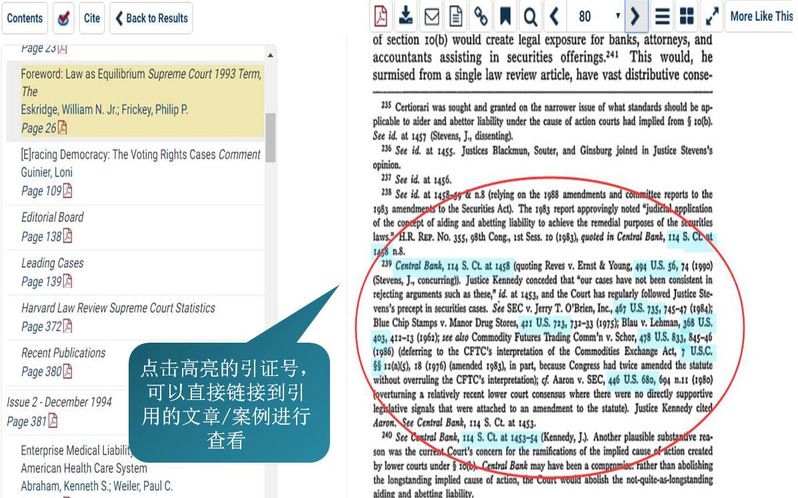 从2013年12月20日开始,HeinOnline数据库通过内置的超链接形式,为HeinOnline核心库用户提供美国联邦和各州的判例法,并提供判例法引证号检索服务。找到该判例的全文信息,同时可以找到引用该判例的相关期刊文章或相关的判例,以及该判例是否依然有效。同时,检索到的文章所引用的判例引证号可以直接连接到所引用的判例全文,帮助读者更好的进行相关的学术研究。