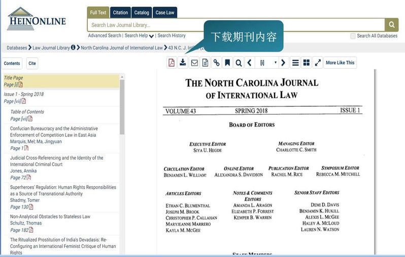 示例:检索《North Carolina Journal of International Law》期刊并通览